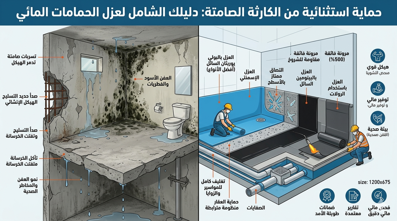 يُعد الحمام من أكثر الأماكن حيوية في أي مساحة سكنية، ولكنه في الوقت نفسه يُعتبر الحلقة الأضعف التي قد تهدد سلامة الهيكل الإنشائي للمبنى بأكمله. إن الاستخدام اليومي والمستمر للمياه، وتصاعد الأبخرة، وتقلبات درجات الحرارة، يخلق بيئة قاسية تتطلب حماية استثنائية. الكثير من أصحاب المنازل يقعون في فخ الاعتقاد بأن السيراميك والترويبة (الفواصل الإسمنتية) تكفي لمنع تسرب المياه، ليكتشفوا لاحقاً بقع الرطوبة البشعة تتسلق جدران الغرف المجاورة، أو الأسوأ، تساقط قطرات المياه على أسقف الطابق السفلي.